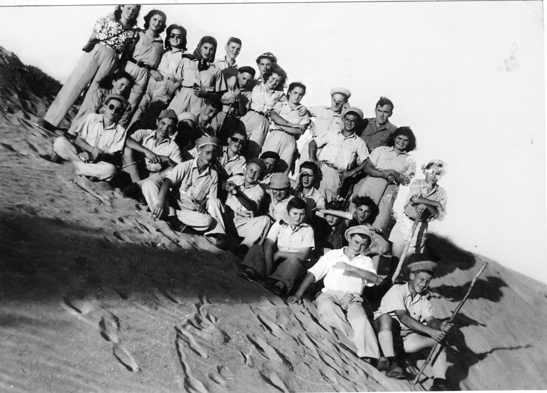 Displayed in Photo: שניאור רייכר, מיכל דינה, אברהם איזנשטט [מדריך], שמעון מודובניק [גיסו של אריק שרון, שמואל קורל, שושנה שמלצר, דבורה ריצ'קר, אהרון אידלמן, אפרים פוקס, ציפורה שניצר, לוקה שרף, מרגלית שרון, יואל להב, ארנה פוקס, יצחק מלצר, משה פרויד, מורדכי מוסקוביץ, יהודית בפט