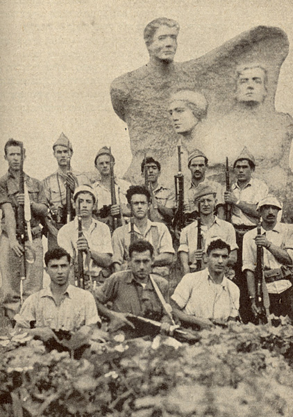 קבוצת חברי פלמ"ח ליד האנדרטה לאפרים צ'יז'יק, מגן חולדה, ולשרה אחותו. יהושע עומד שני מימין