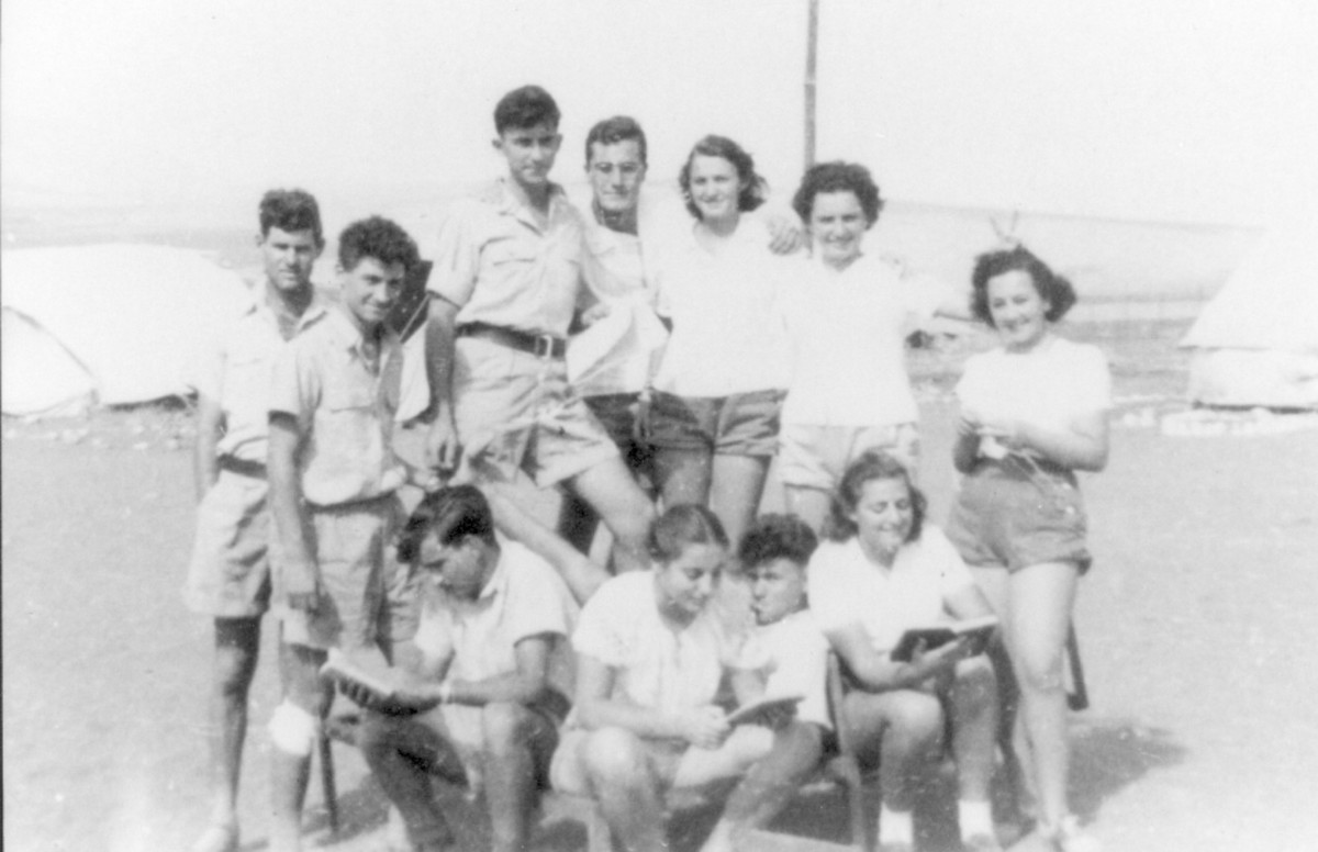הכשרת עין-גב, תיאור התמונה: במחנה הפלמ"ח בבית-השיטה, מופיעים בתמונה: עומדים: דבורה שביט (הופמן) חולדה אבידן (קסטן), רחל גולן (מילנר), מיכאל יעקבי ז"ל, שמואל (מלו) זיידמן, חדוי וייסגרוס ז"ל, הלל יואכים, יושבים: אילנה בן- דוד (דייגי), יוסי כרמל, אסתר (אתיקה) זעירא, עמי דניאלי, תאריך צילום: 1947, נתקבל מ: רחל פלונסקר (ברטר)