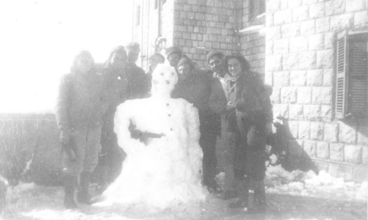 הכשרת עין-גב, תיאור התמונה: חורף בהר כנען, מופיעים בתמונה: מימין: שרה ברנדס (שנקר), יעקב מטרי, אברהם (ג'ינג'י) נרפן, יצחק (כושי) דר, חיה מינצברג, חדוי וייסגרוס ז"ל, שמואל ליפשיץ, יזרעאלה (רלי) פלג (שלכטר). תאריך צילום: מרץ 1948, נתקבל מ: אורי ארנון